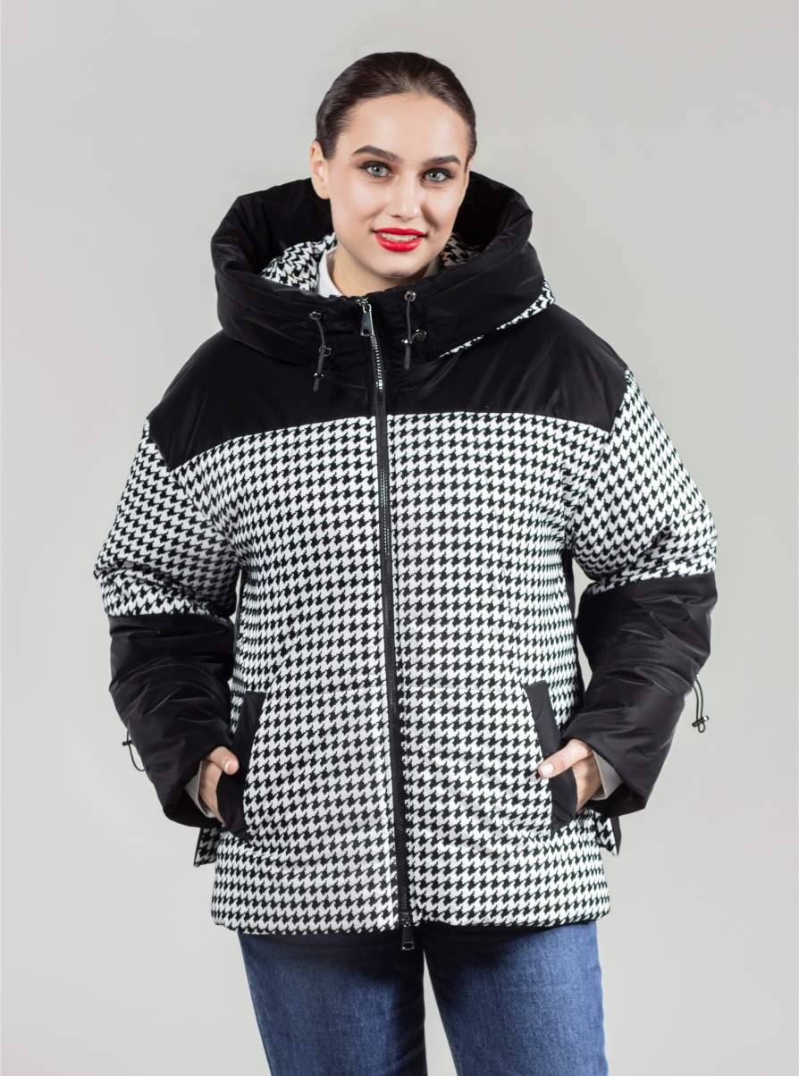 Короткий пуховик с интересным дизайном. Взгляд сразу притягивает заметная и яркая расцветка: в изделии преобладает узор «гусиная лапка», на контрасте сочетающийся с чёрными вставками на рукавах и капюшоне. Воротник-стойка, плавно переходящий в капюшон, обеспечивает тепло и уют. Удобная длина позволят комфортно ездить и в автомобиле, и передвигаться пешком.Характеристики