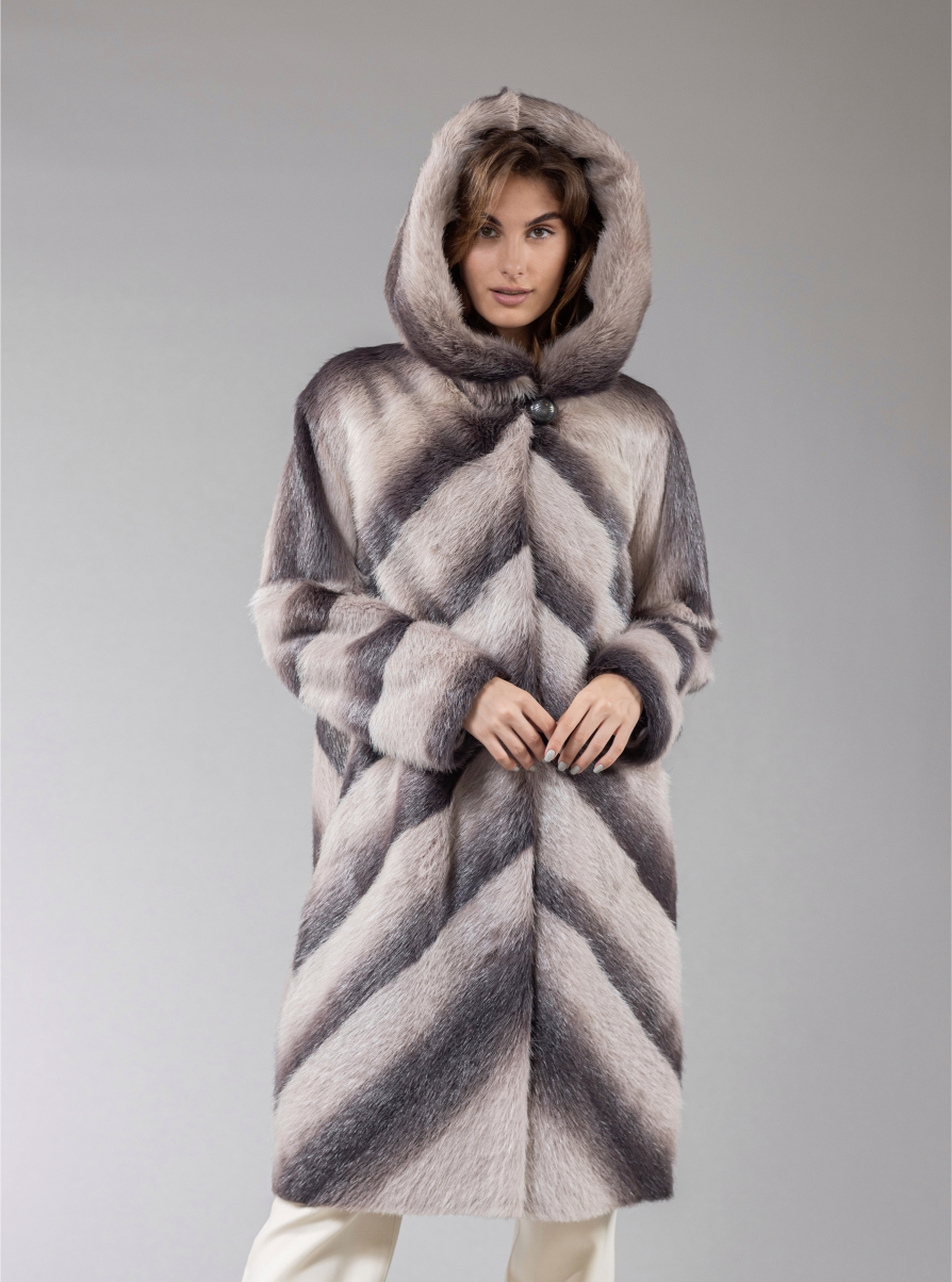 Яркое пальто из меха нутрии с капюшоном в расцветке «деграде». Шуба «Влада» продолжает линейку светлых моделей нутриевых шуб «Тверской меховой». Современные технологии крашения позволили добиться идеально белого цвета меха нутрии, градиентом переходящего в пепельно-серый. Потрясающий эффект! Диагонально-поперечное расположение шкур и полноценная длина 110 см создает эффект «елочки», вытягивает и стройнит фигуру в любом размере: от 46 до 56. Светлый цвет и длинная ость меха нутрии освежают черты лица, особенно при надетом капюшоне, делают образ выразительнее и моложе. За счет водоотталкивающих свойств меха нутрии шубе «Влада» не страшны мокрый снег и даже зимний дождь. Объемный капюшон сохраняет прическу в любую непогоду, избавляет от проблемы выбора головного убора. Шуба «Влада» без дополнительных украшений создаст свежий и легкий зимний образ, подойдет для длительной повседневной носки или для эффектных выходов «в свет». Сияйте и впечатляйте без лишних затрат и оглядки на погоду!Характеристики